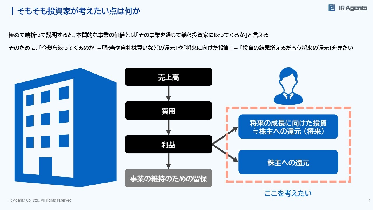 それを考えるために、「配当や自社株買いによる還元をどれくらいしてくれるのか」「将来に向けて投資を行ったことで業績が成長した結果、将来いくら還元してくれるのか」といったことを見たいというのが投資家の気持ちだと思っています。