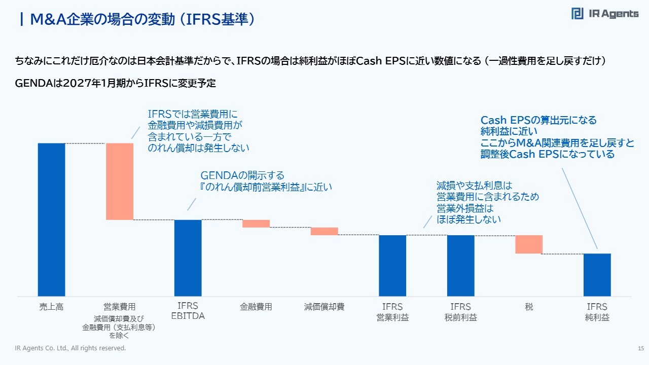 関本:ちなみに、ここまで面倒なことになっているのは、日本会計基準という方法をとっているためです。IFRS会計基準を採用している場合には、純利益はほぼGENDAが開示しているCash EPSに近い数値となります。あとはM&A関連費用などの一過性費用を足し戻すくらいです。
