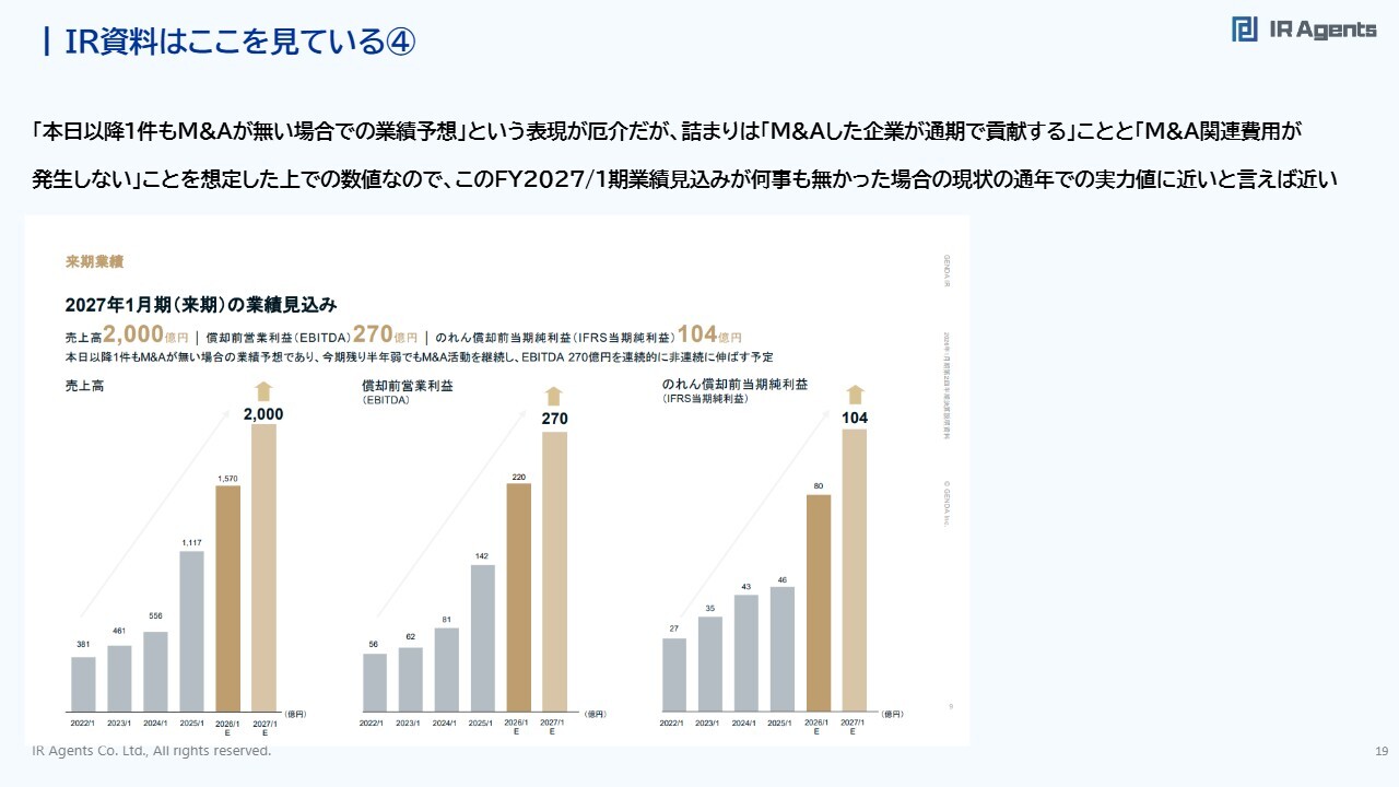 スライドは2027年1月期の業績見込みですが、本当に何事もなかった場合の現状の通年での実力値に近いため、ここが着実に伸びているかどうかも大事なポイントです。