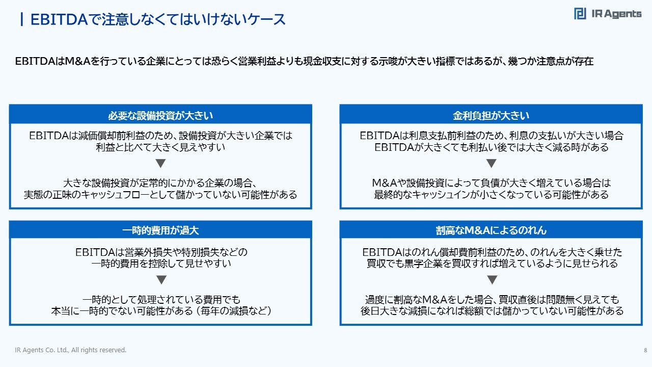 実際、昔からよく「ごまかされやすい指標に注意しなければいけない」というふうに私も厳しく指導を受けてきました。EBITDAで注意しなければいけないケースというのは、スライドに記載している4つくらいだと思います。