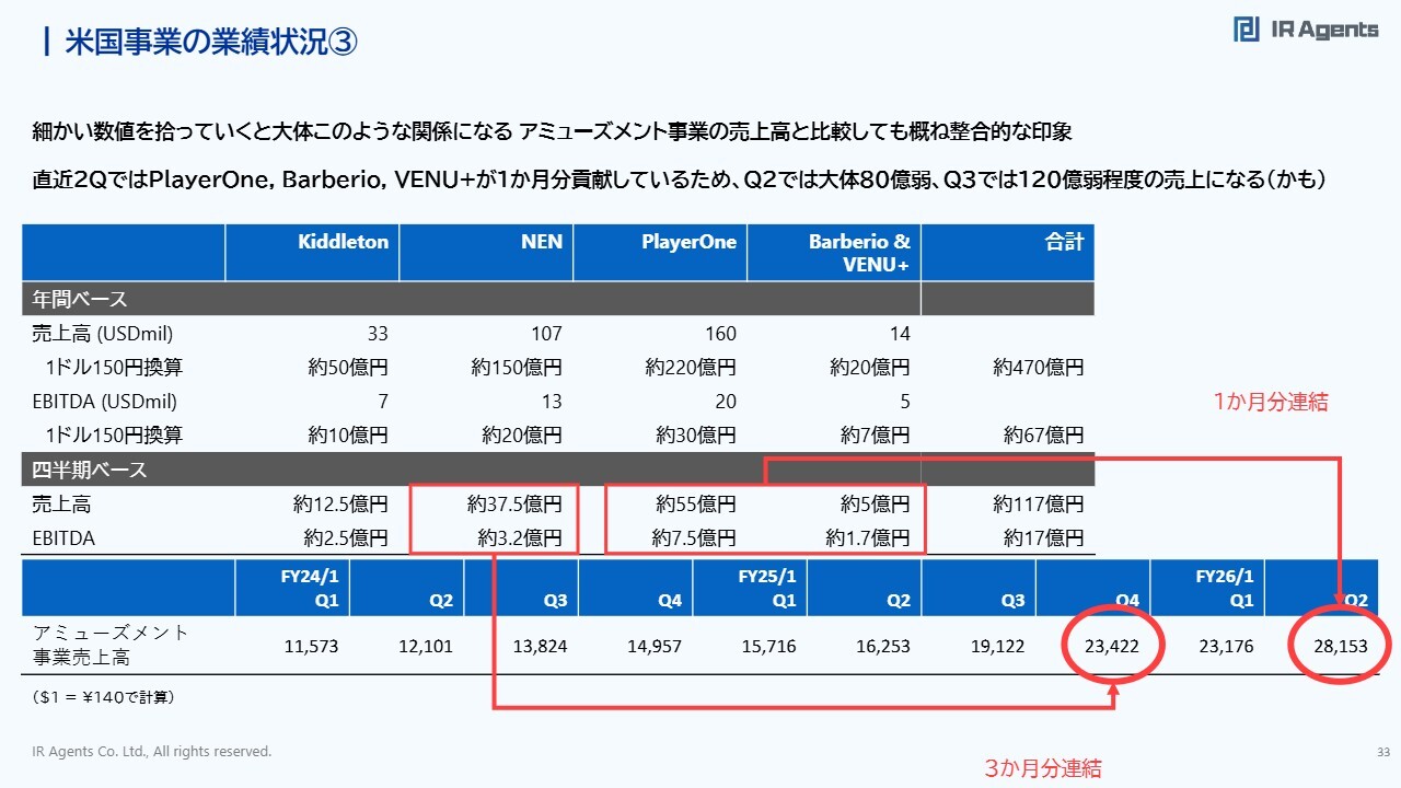 これらをアミューズメント事業の売上高と照合すると、2025年1月期の第3四半期から第4四半期にかけて、NENが連結される時に3ヶ月分で約40億円増加しています。また今期2026年1月期の第1四半期から第2四半期にかけては、PlayerOneとBarberio・VENU+が1ヶ月分連結されているため、この部分も売上として伸びています。
