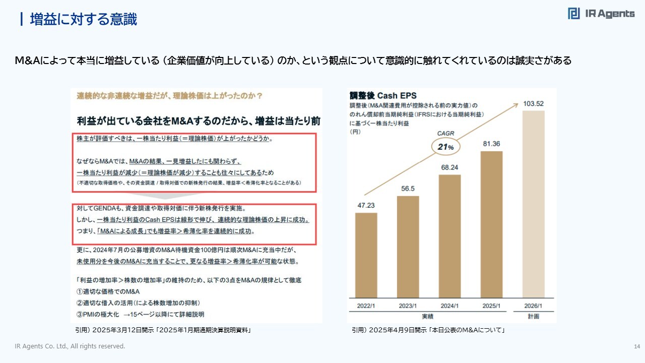 その希薄化を考慮している点も踏まえて、調整後Cash EPSというかたちで1株当たりの当期純利益、つまり希薄化を考慮した上での利益を見てほしいということだと思うので、連続M&A企業の指標としては最も適切なKPIの1つかと思っています。