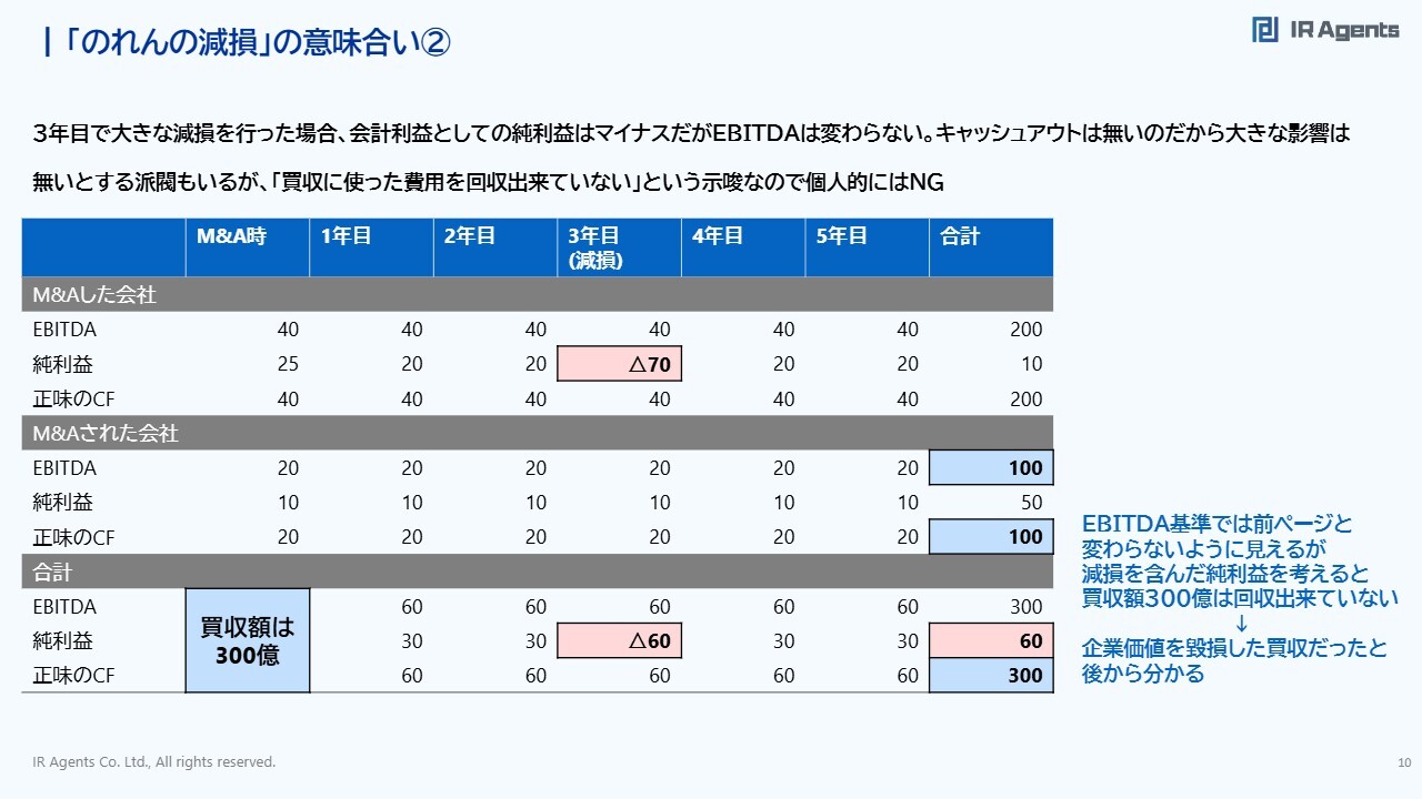 このように、途中でのれんが減損されるのは、買収に使った費用を回収できていないという示唆ですので、個人的には正直NGだと思っています。人によっては「減損は減損で、キャッシュアウトがないのだから影響はない」と言う人もいますが、投資家視点では、企業がしっかり投資を回収し切れず、無駄なお金の使い方をしたということなのです。