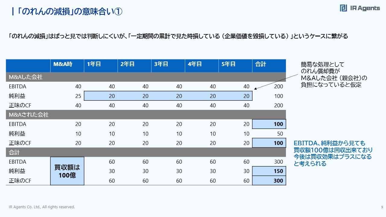 先ほどの100億円で買収したケースで考えると、5年間で費用を回収できているのですが、3年目で少し減損を出すことで、なんと4年目、5年目の純利益が前年比で5億円くらい増えて見えています。このように翌年以降の見え方が良くなる上、実態としては買収額に対してきちんと回収ができているため、「このM&Aは企業価値を毀損するものではなかった」という評価になります。