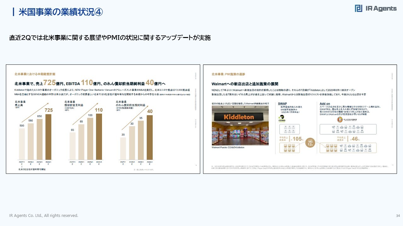 例えば、中期的な見通しとして、北米事業で売上高725億円、EBITDA110億円を目指しているということと、スライド右側に示しているように、PMI施策としてSWAPとAdd onという2つのパターンを展開し、それぞれどのように貢献するかについて、大きく触れています。