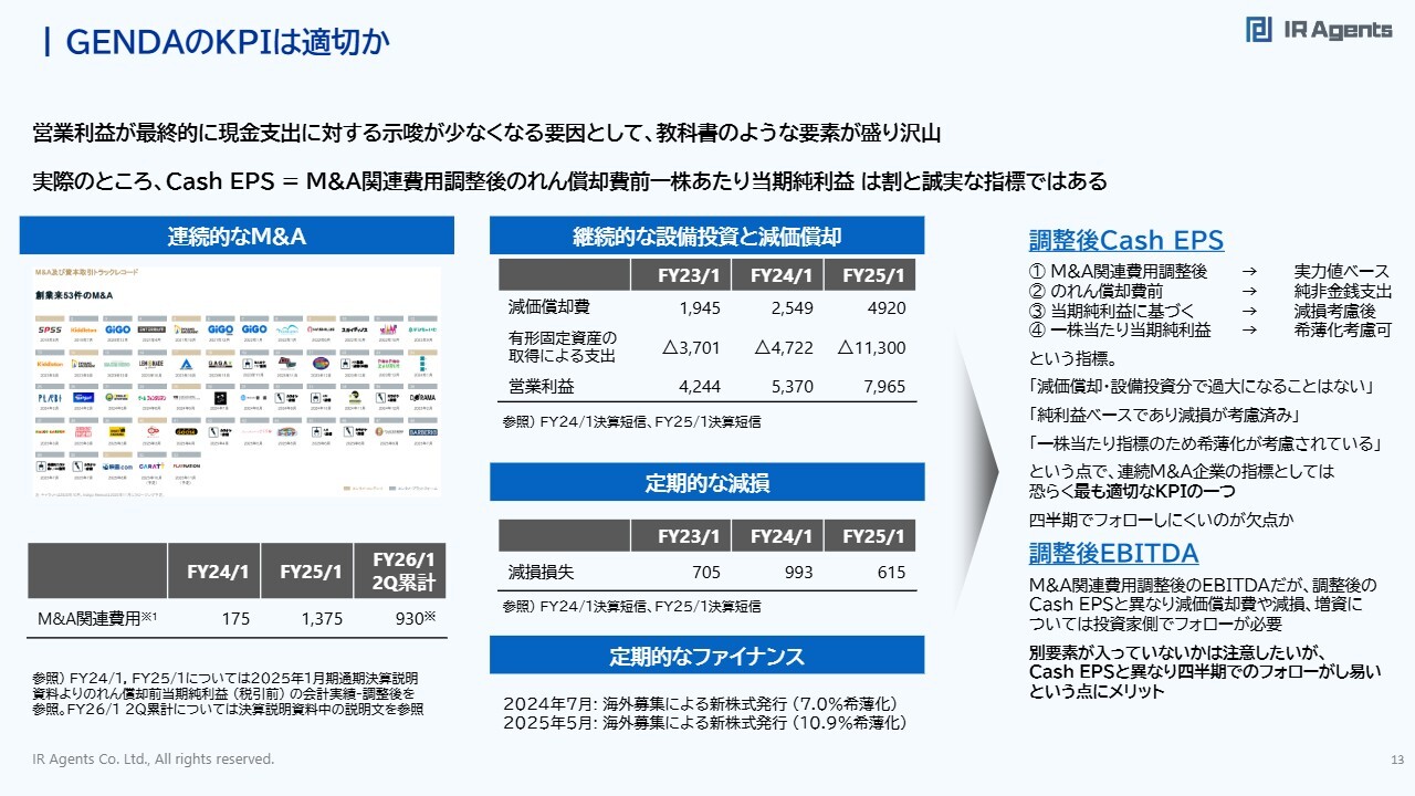 調整後のCash EPSは、M&A関連費用が控除される前の利益から、さらにのれん償却費を除いた上での当期純利益を、1株当たりの数値に直した数字です。GENDAは、このCash EPSやEBITDAの数字を見てほしいと説明しています。