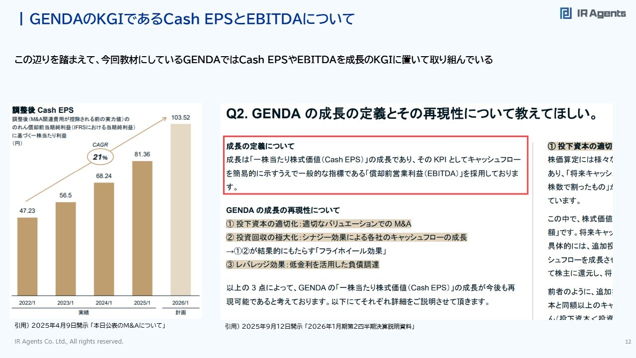 これらの要素を踏まえた上で、着実にGENDAの企業価値が増加していることをどう考えるかにおいて、このCash EPSという指標を出してきたのだと思っています。