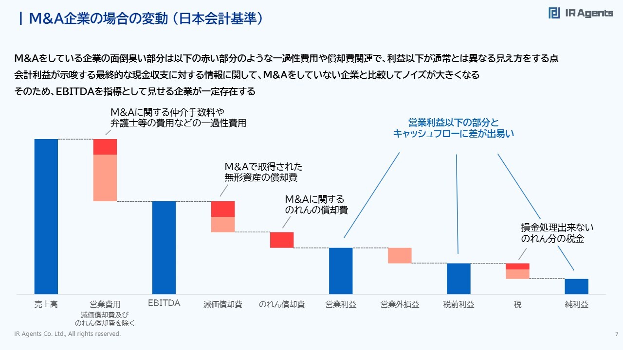 スライドのグラフで示している濃い赤色の部分が、M&A企業に特有の費用です。売上高に対して、先ほどは「人件費や材料費などが発生する」とお話ししましたが、M&A企業の場合は、例えばM&Aに関する仲介手数料や弁護士費用といった一過性の費用が入ってきます。