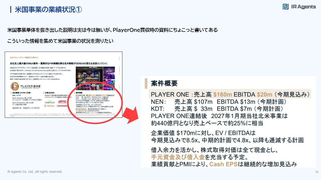 例えば、PlayerOneの買収時の資料には、PlayerOneの売上高160ミリオンドル、NENは107ミリオンドル、Kiddletonは33ミリオンドルと、見込みの売上高が記載してあります。このような情報を集めて、米国事業の状況を推測したいと思います。