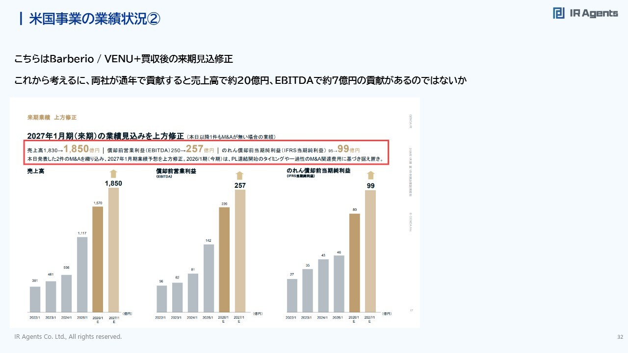 関本:スライドは、BarberioとVENU+買収後に、来期の業績見込みを上方修正したものです。売上高でプラス20億円、EBITDAでプラス7億円修正されています。