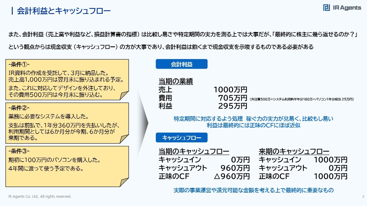 この場合、売上は今期に計上されるものの、現金1,000万円が入ってくるのは来期になるといったタイムラグが発生します。一方で、デザインの外注費は今期に支払うことになるため、キャッシュアウトは今期になるといったかたちになります。結果として、会計利益とキャッシュフローには差が出ることが多々あります。
