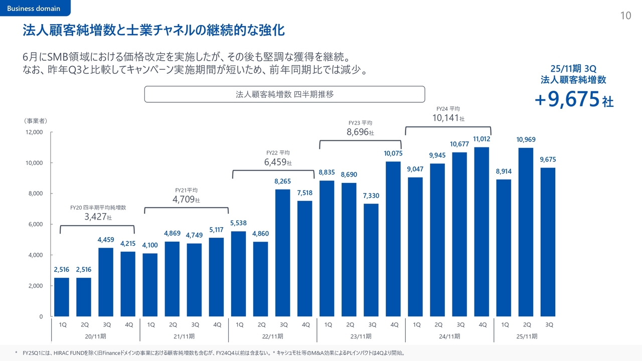 法人顧客の純増数は9,675社となり、引き続き高水準を維持しています。昨年同期と比べてキャンペーン期間が短い中でも、士業チャネル経由の獲得強化を進めることで、長期的な顧客基盤の積み上げが進行しています。今四半期は広告宣伝費が比較的少ない期間でしたが、そのような状況下でも効率的に新規顧客を獲得し続けることができました。