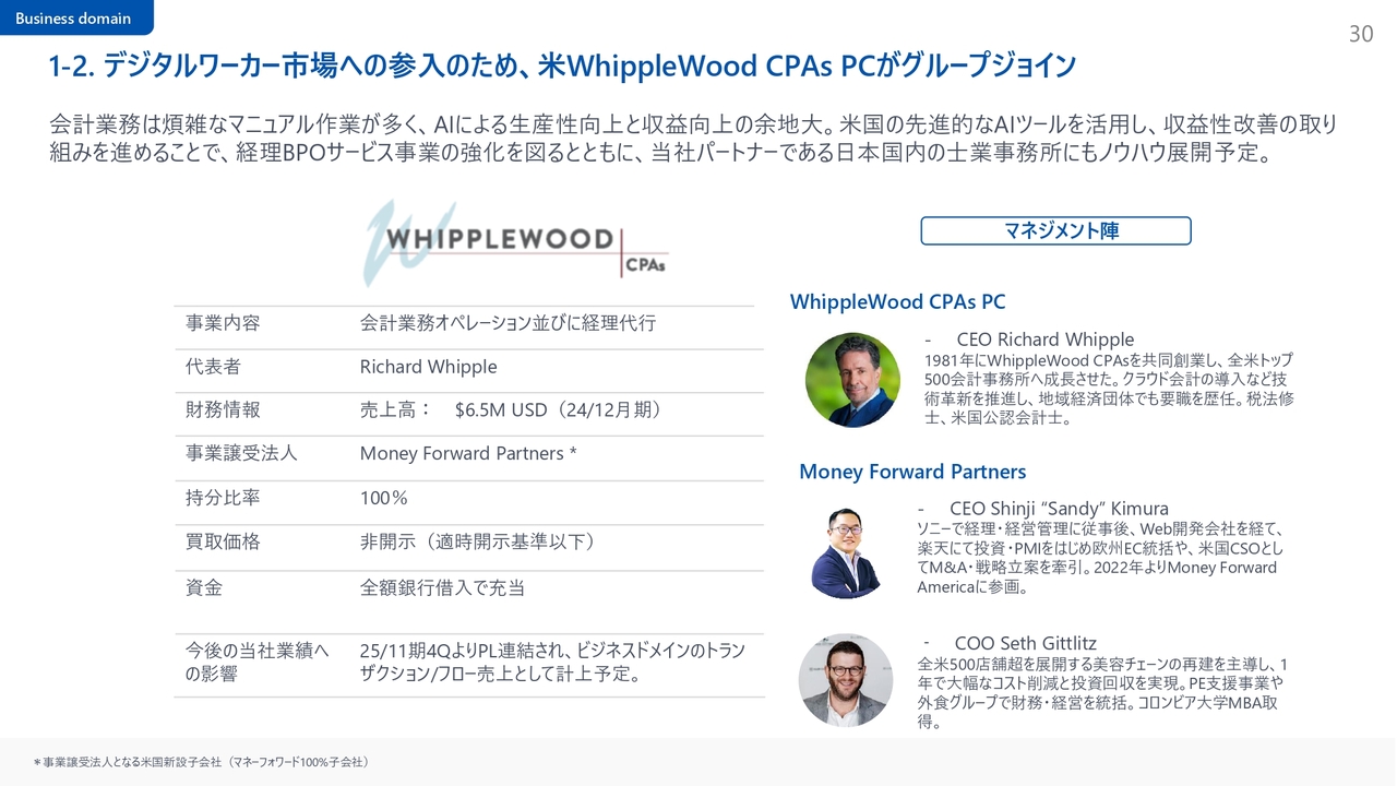 もう1つの新しい取り組みとして、米国の会計業務オペレーションおよび経理代行を行っているWhippleWood CPAs PC社がグループに加わりました。この会社はコロラド州にあり、CEOのRichard Whipple氏というすばらしい経営者がいらっしゃいます。彼と私たちの「Money Forward Partners」のShinji “Sandy” Kimura氏およびSeth Gittlitz氏というメンバーが協力し、現在PMIを進めています。