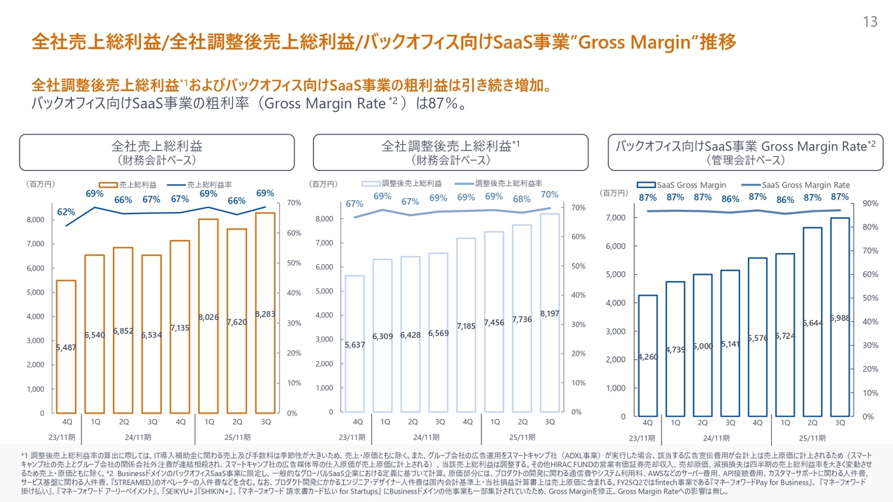 粗利とGross Marginについてです。全社調整後の売上総利益は前四半期に引き続き上昇しています。バックオフィス向けSaaS事業のGross Margin率も87パーセントと、引き続き高水準を維持しています。