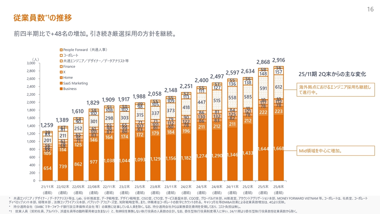 従業員数は前四半期比で48名増加しました。引き続き厳選採用を進めており、特にMid領域や海外拠点でのエンジニア採用を強化しています。