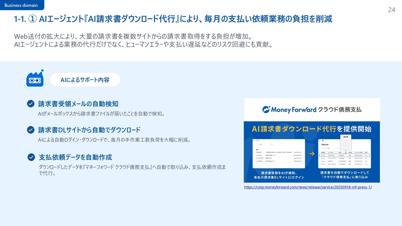 1-1. ① AIエージェント『AI請求書ダウンロード代行』により、毎月の支払い依頼業務の負担を削減