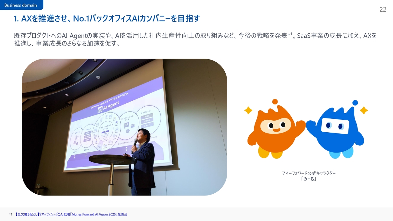 まず、AI分野の取り組みについてです。4月のAI戦略「Money Forward AI Vision 2025」発表会でもご説明したとおり、「AXを推進し、No.1バックオフィスAIカンパニーを目指す」というプロジェクトを進めています。