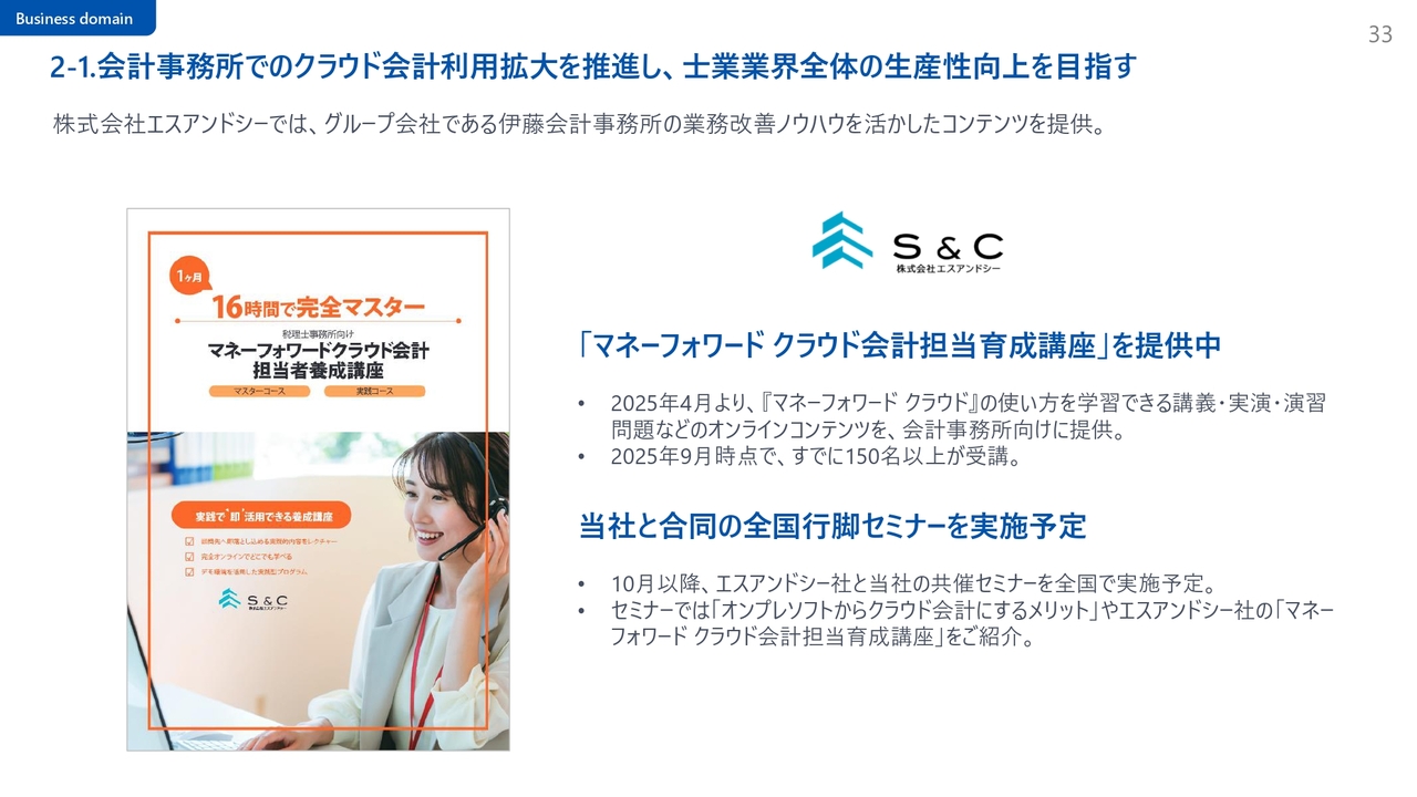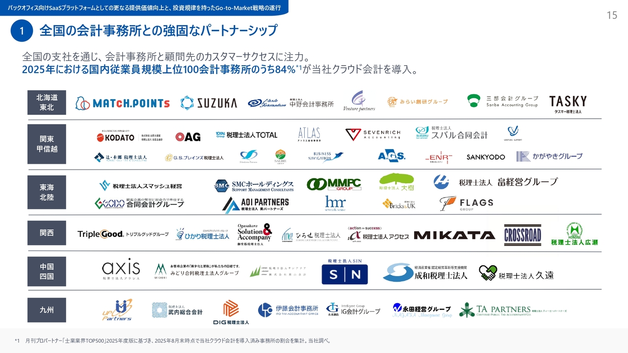 1点うれしいニュースをお伝えします。「Business Overview for Investors」15ページに記載されているとおり、2025年度の国内従業員規模上位トップ100の会計事務所における当社のカバー率が、78パーセントから84パーセントに上昇しました。