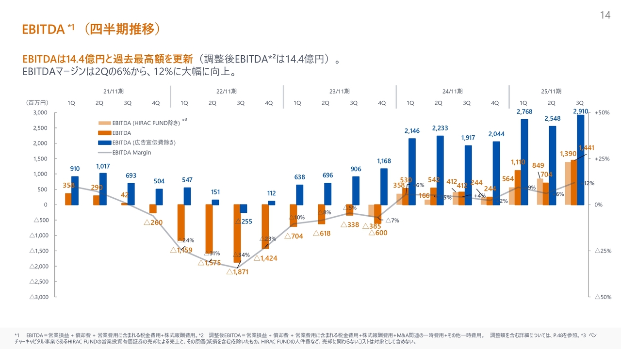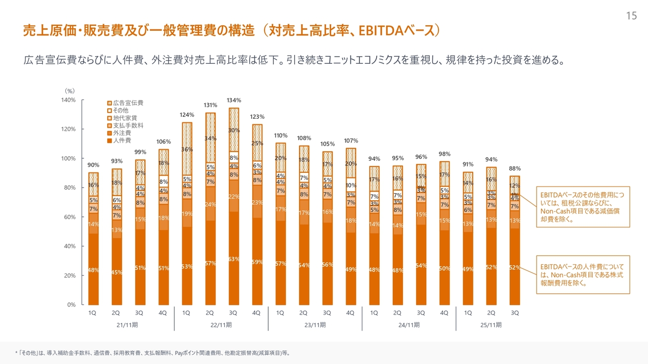 なお、第4四半期は広告宣伝費が昨年同様に集中する四半期であり、オフィスの増床費用として一時費用が発生するため、第3四半期と比較してEBITDAが減少する可能性があります。