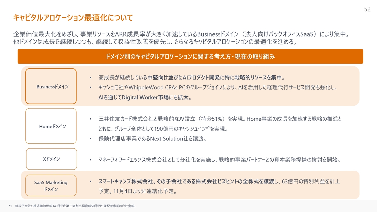 グループキャピタルアロケーションの最適化については、従来からお伝えしているように、事業リソースをMoney Forward Businessドメインにより集中させる方針です。これに伴い、SaaS Marketingドメインのスマートキャンプ社の株式譲渡を決定しました。2025年11月4日から非連結化の予定です。