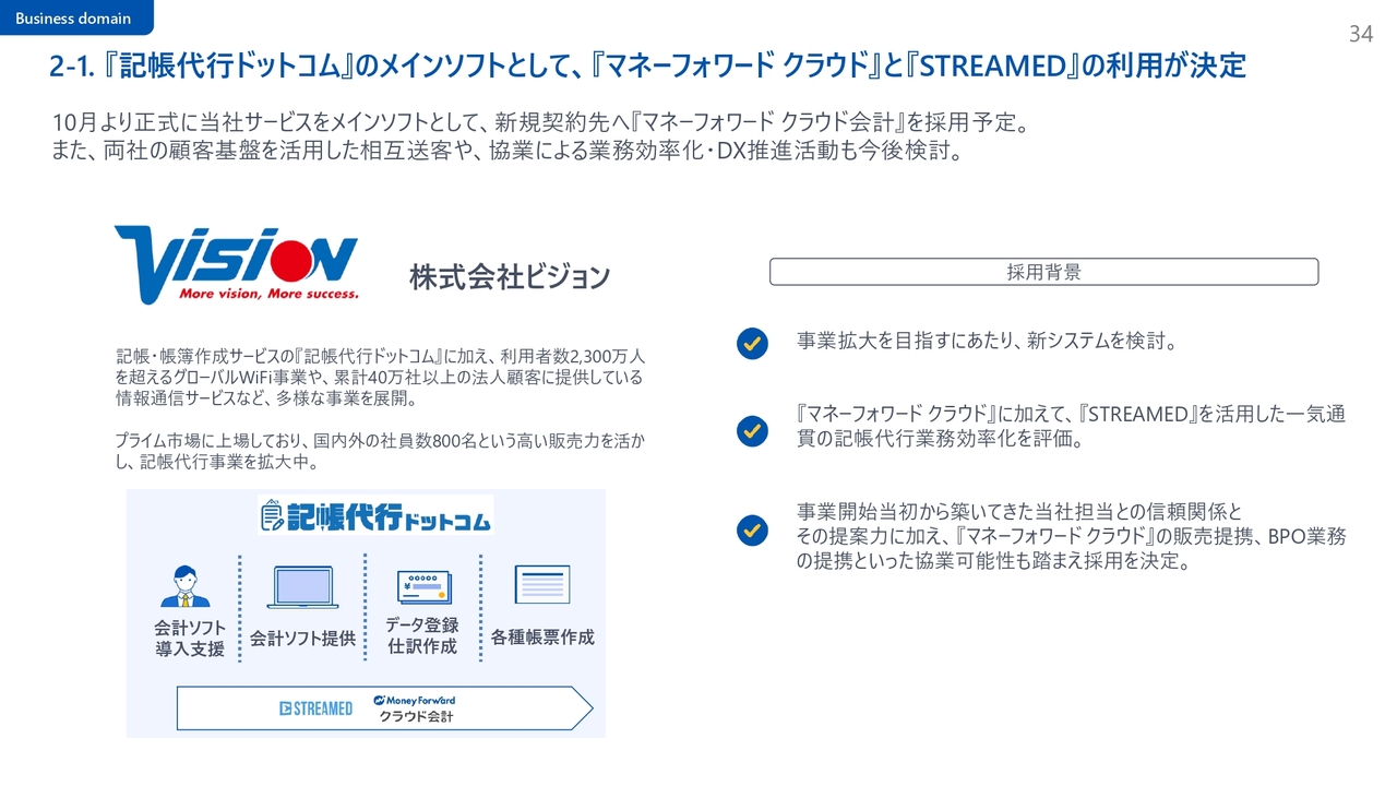 士業事務所さまに加えて、非常に有名な企業である株式会社ビジョンさまの記帳代行サービス「記帳代行ドットコム」において、メインソフトとして当社の「マネーフォワード」と「STREAMED」を採用いただきました。