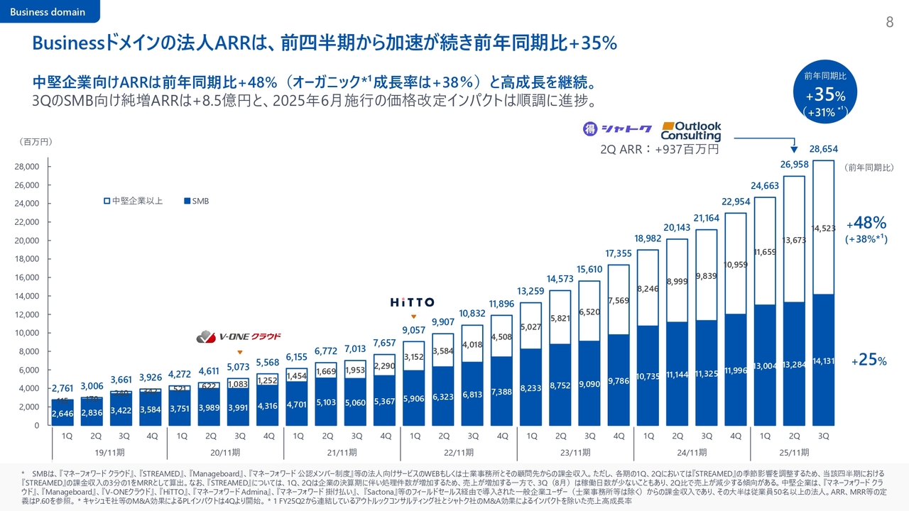 第2四半期から連結開始したM&Aの効果を除いても、オーガニックで前年比32パーセント成長しており、成長が加速しています。この成長を牽引している要因としては、SMB領域での価格改定と中堅企業領域での新規顧客獲得が挙げられます。