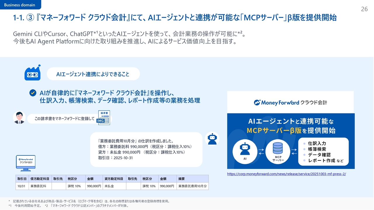さらに、大きなローンチとして、「マネーフォワード クラウド会計」においてAIエージェントと連携可能な「MCPサーバー」β版の提供を開始しました。それぞれの詳細については、次のスライドでご説明します。