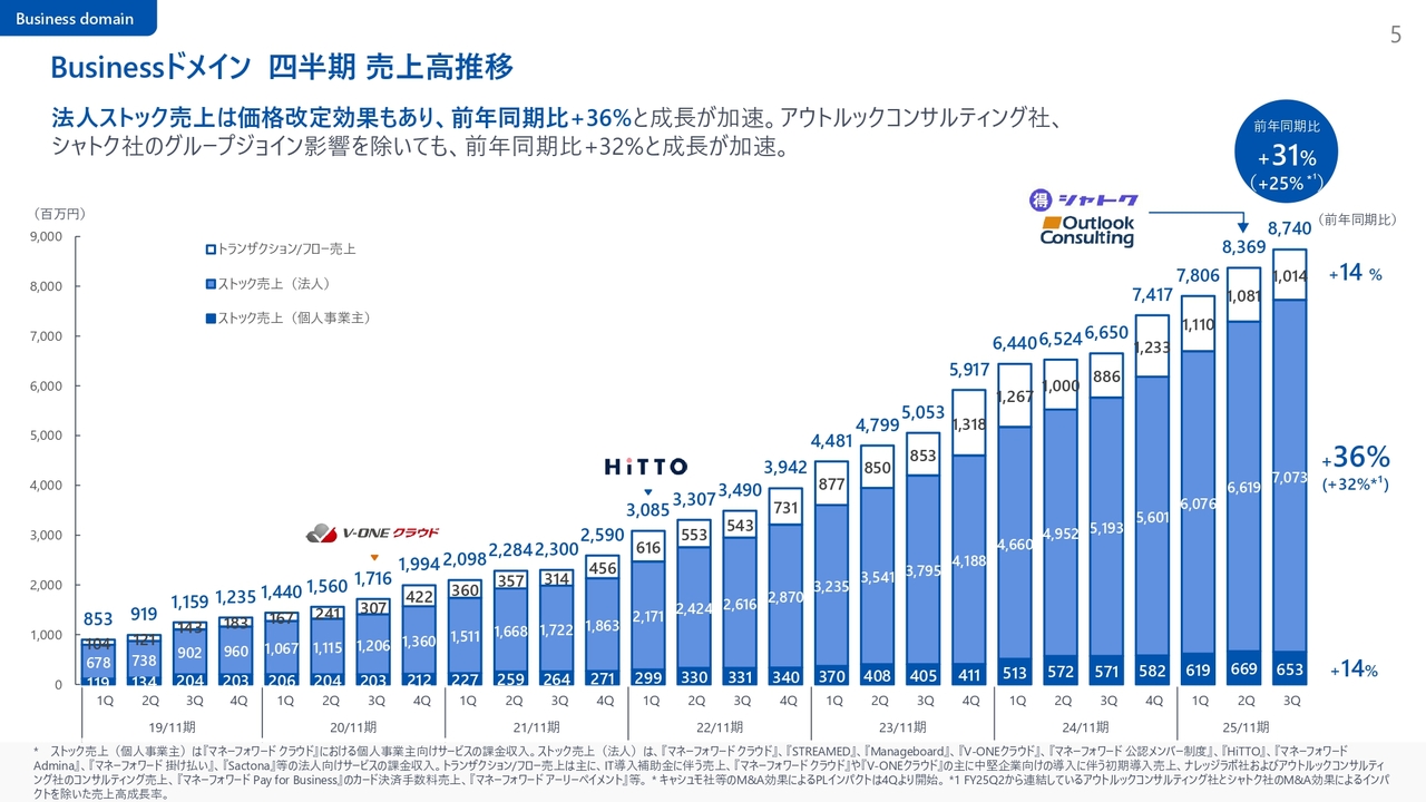 Money Forward Businessドメインの四半期売上高についてです。Money Forward Businessドメイン全体で前年比31パーセント増となっています。特に法人のストック売上は非常に力強く伸びており、成長率は前年比36パーセントと加速しています。