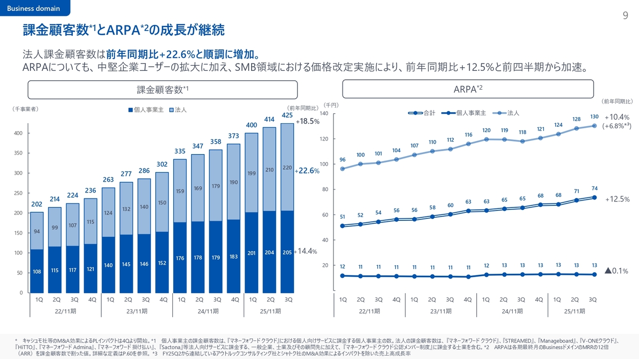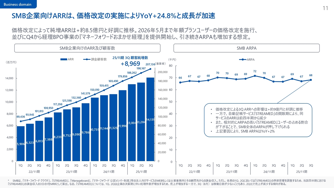 SMB全体のARPAについては、高単価商材である「STREAMED」の影響を受けて変動する性質がありますが、先日ローンチした「マネーフォワードおまかせ経理」(経理BPOサービス)も、今後ARPA上昇要因として貢献することを期待しています。