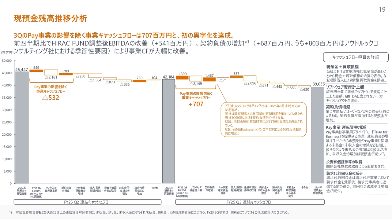 最後に、事業キャッシュフローについてです。BtoBカード事業の影響を除いた事業キャッシュフローはプラス7億円となり、初の黒字化を達成しました。契約負債の積み上がりやEBITDAの改善が寄与しています。季節的な要素はあるものの、キャッシュ創出力が高まっている証拠だと思います。