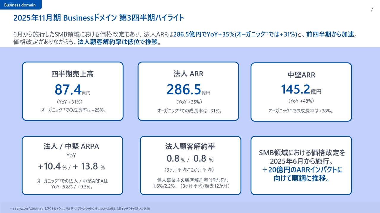 Money Forward Businessドメインのハイライトです。法人ARRは前年同期比35パーセント増、オーガニックでも31パーセント増と、第2四半期から成長率が加速しています。SMBの価格改定は6月から始まりましたが、価格改定があっても顧客解約率は昨年と同水準で、非常に低い水準に抑えられています。