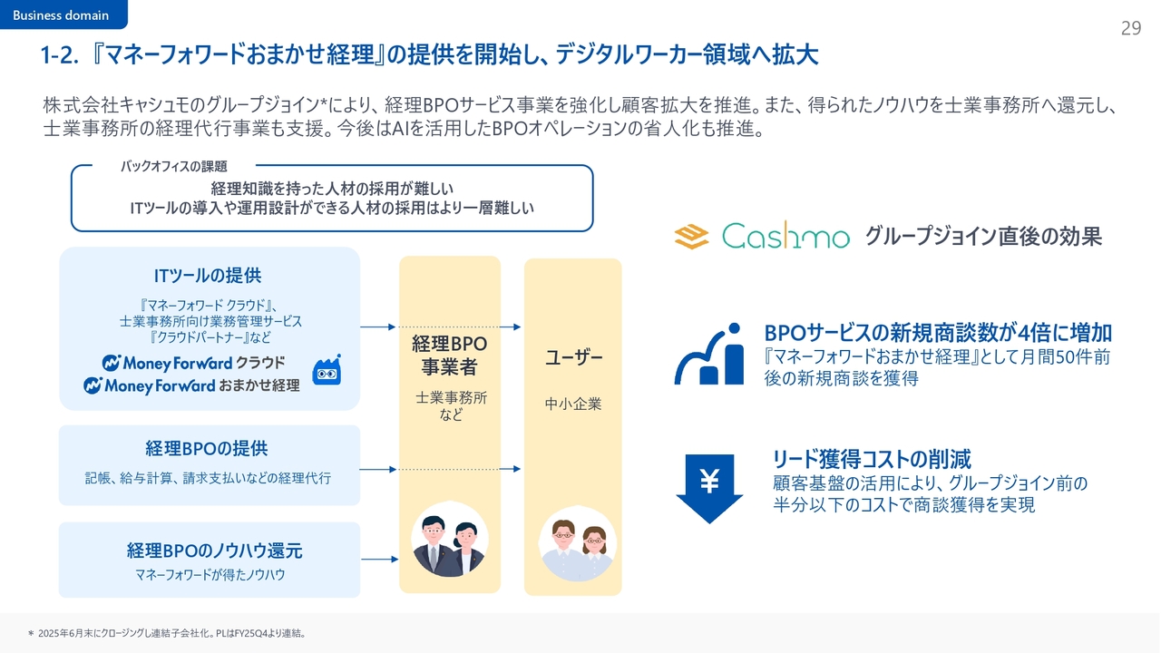 まだグループジョインから数ヶ月の状況ですが、現在はPMIに取り組んでいます。「マネーフォワード おまかせ経理」の新規商談の獲得が好調で、グループジョイン前と比較して4倍に増加しています。また、当社の顧客基盤を活用することで、グループジョイン前の半分以下のコストでリード獲得が可能となり、現在のところ順調にシナジーを発揮できている状況です。