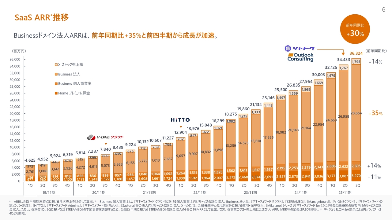 SaaS ARRの推移です。SaaS ARRは363億円で、前年同期比30パーセント増となり、引き続き順調に拡大しています。特に、Money Forward Businessドメインの法人ARRは286億円で、前年同期比35パーセント増となっています。法人ARRは中堅企業およびSMB企業の両方で力強く成長しています。