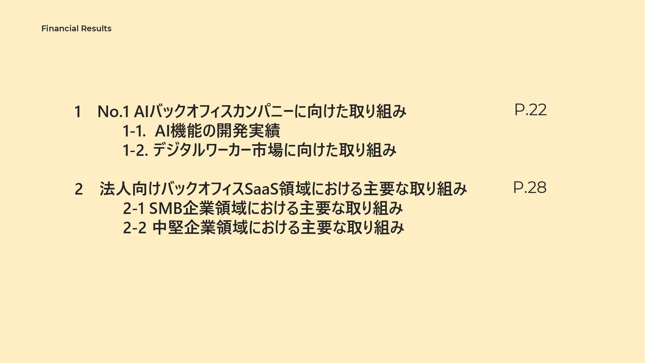 1点目は「No.1 AIバックオフィスカンパニーに向けた取り組み」です。当社は今年4月にAI戦略「Money Forward AI Vision 2025」を発表しました。今四半期も取り組みを続けており、その進捗についてご説明します。また、デジタルワーカー市場は非常に大きな規模が期待される分野ですので、その市場に向けた取り組みについてもお話しします。