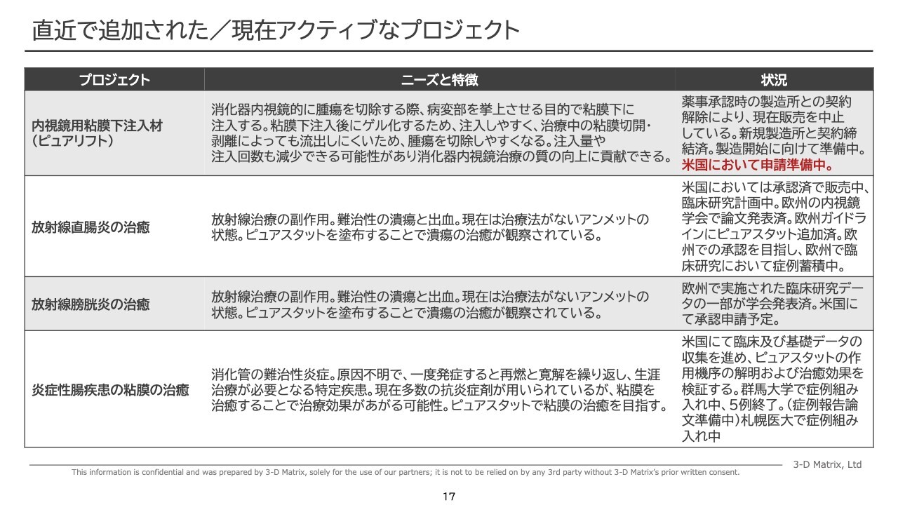 内視鏡用粘膜下注入材「ピュアリフト」は、日本では現在販売が中止されていますが、新規製造所で製造準備を進めています。また、米国においても申請を予定し、現在は申請準備の段階です。
