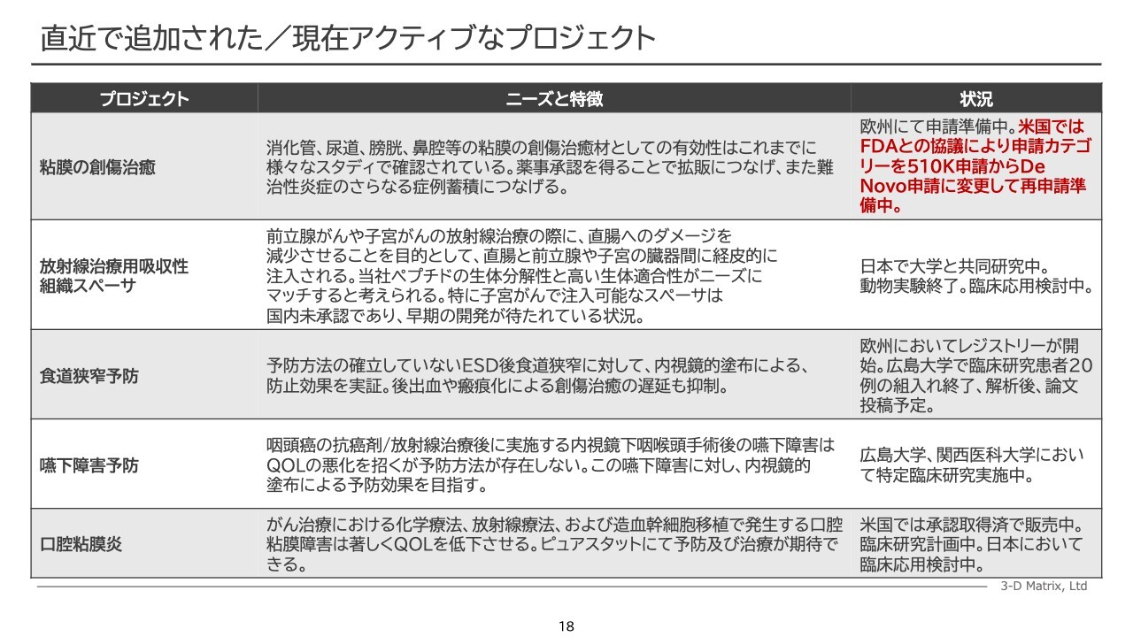粘膜の創傷治癒については、米国ではFDAに510(k)というカテゴリで申請しましたが、FDAとの協議の結果、De Novo 510(k)という申請に変更されました。