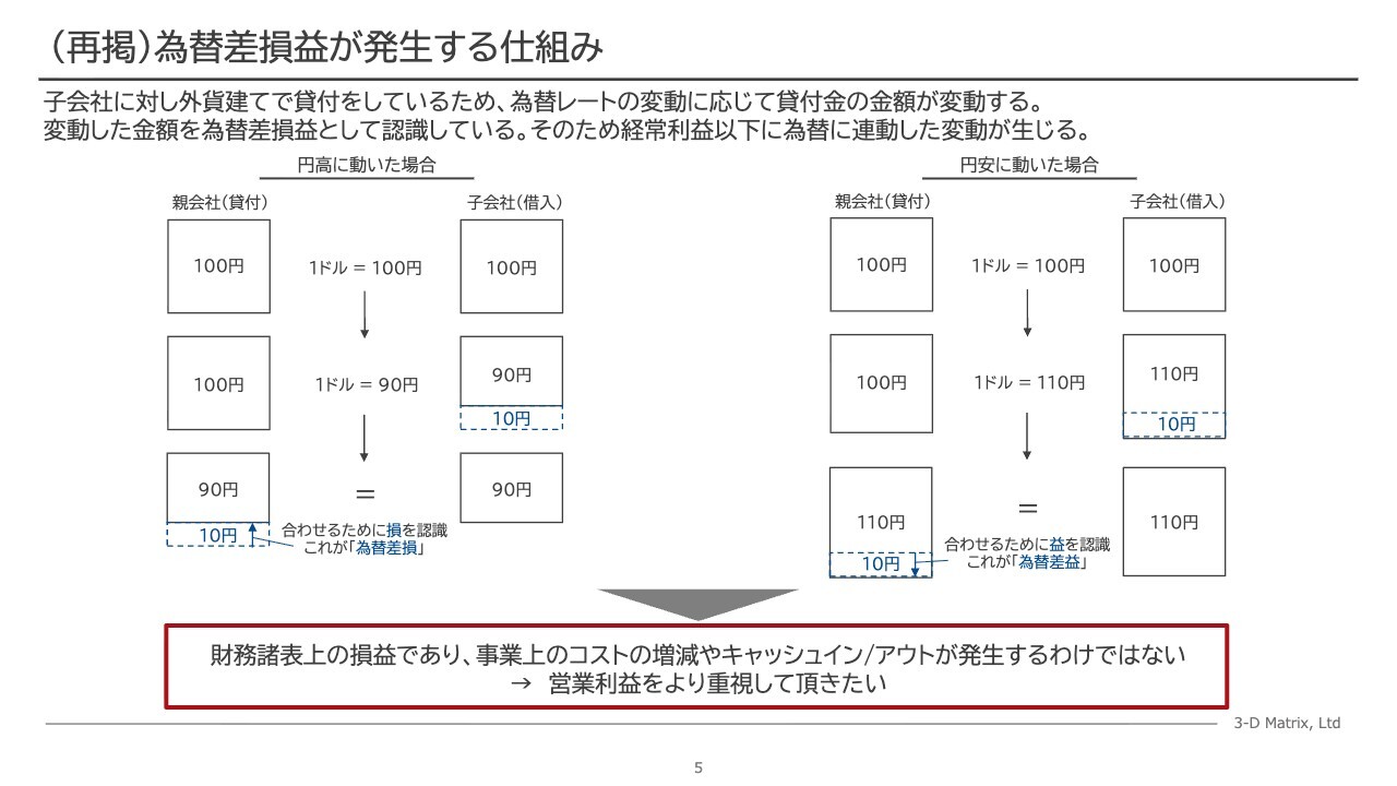為替差損益が発生する仕組みを再掲しました。詳細なご説明は省略しますが、簡単にお伝えします。当社の場合、子会社に対する貸付金が相当額あるため、為替が動くと円ベースで貸付金の金額が膨らんだり減ったりし、為替差損益が発生します。