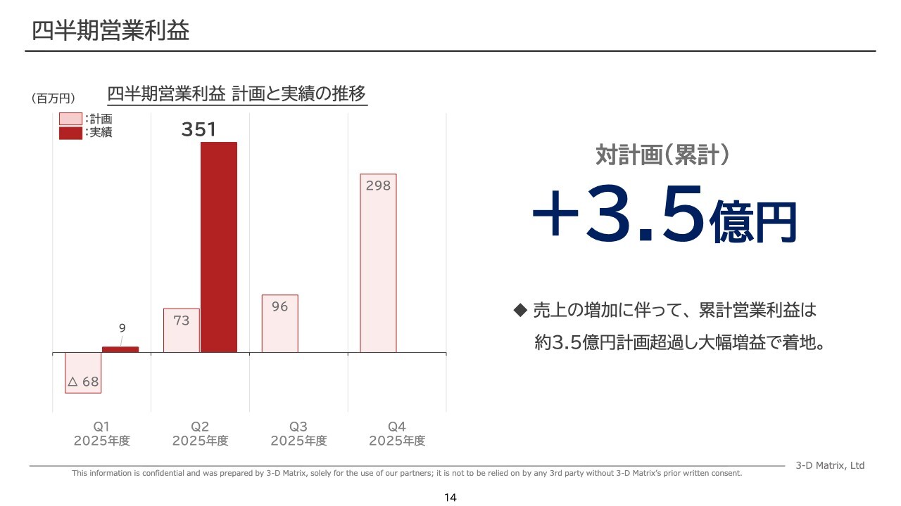 第1四半期は赤字計画でしたが、ほぼ収支均衡で終えることができました。第2四半期では計画を大幅に上回り、高い営業利益を達成しています。売上の増加に伴い、累計営業利益は計画を約3億5,000万円超過し、大幅増益となりました。