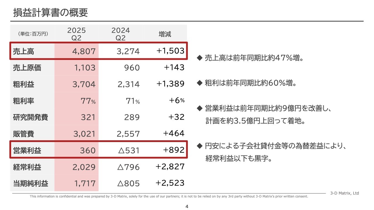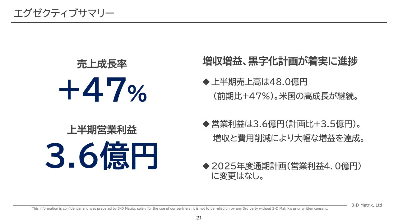 まず、エグゼクティブサマリーです。今期は増収増益を達成し、黒字化計画が着実に進捗しています。上半期の売上高は48億円で、前期比47パーセント増となりました。特に米国市場での高成長が引き続き継続しています。