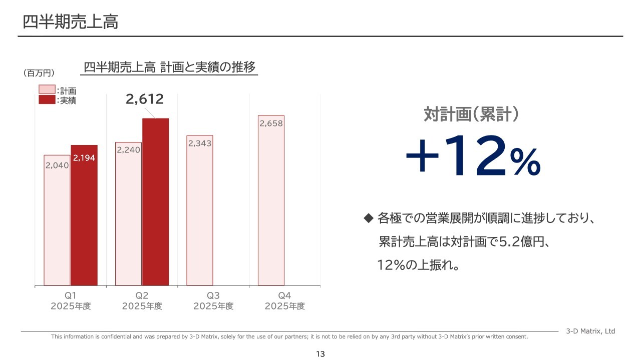 四半期の状況についてです。スライドのグラフで、第1四半期および第2四半期の計画と実績値を示しています。いずれも計画を達成しており、累計では計画に対して12パーセント上振れしています。
