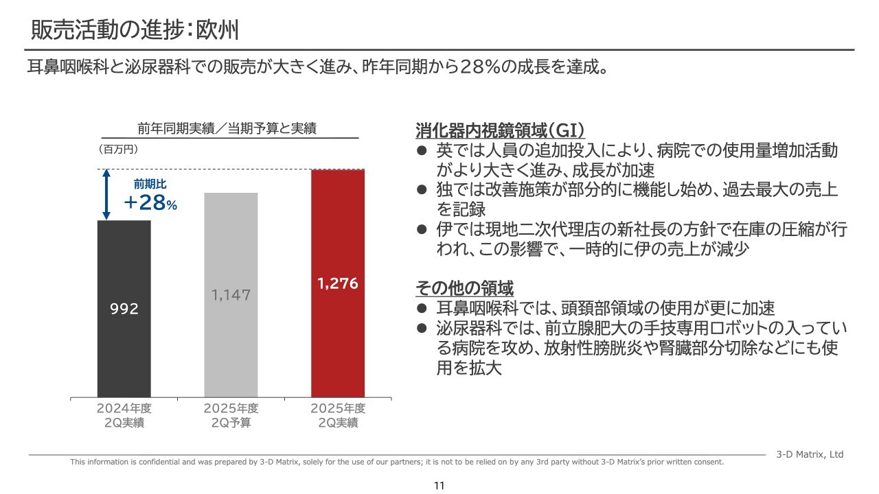 欧州の状況です。耳鼻咽喉科および泌尿器科での販売が大きく伸び、前年同期比で28パーセントの成長を実現しています。また、予算を超える成果を達成しています。
