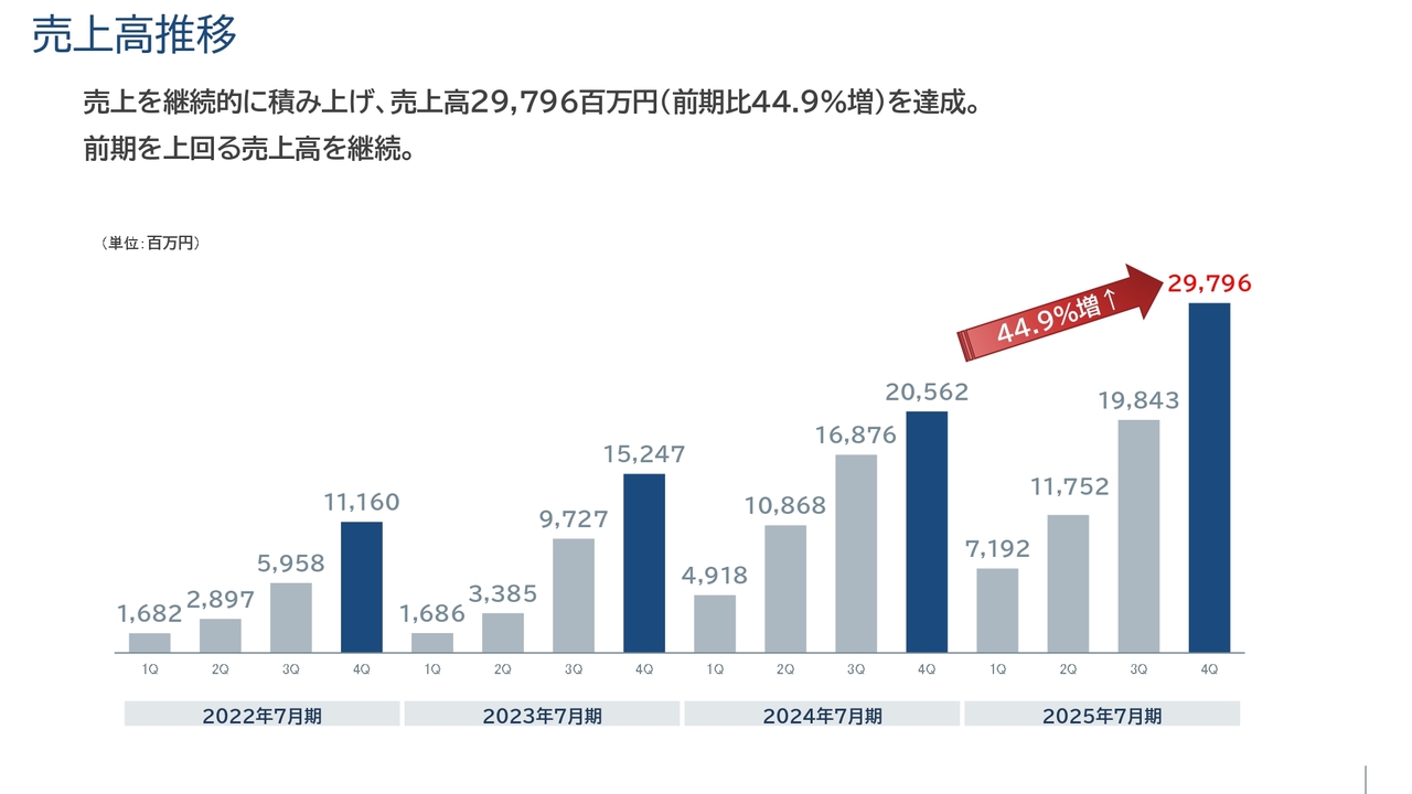 矢吹:2022年に比べて、この頃は通期で111億6,000万円でした。しかし、1年後には通期で152億4,700万円、さらに2年後の2024年には205億6,200万円となり、2025年7月期には297億9,600万円と右肩上がりで成長し、44.9パーセント増を達成しています。