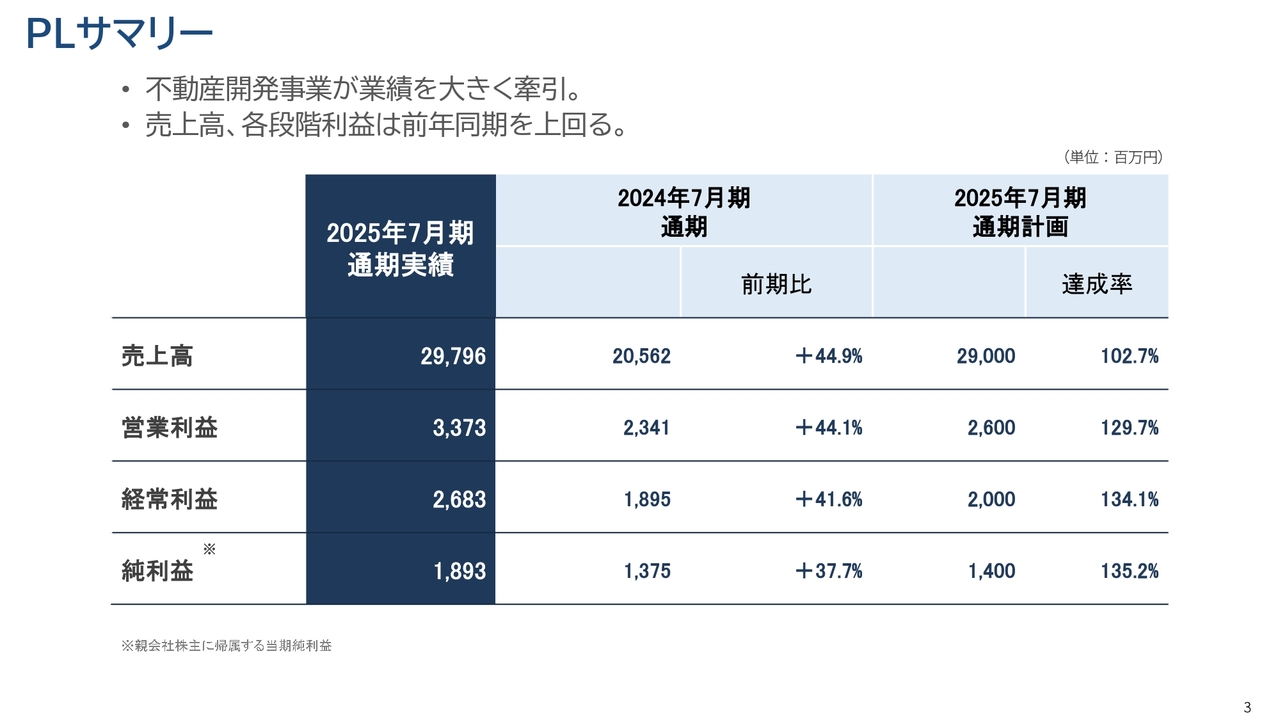 山田:続いて「Performance Overview」として、明豊エンタープライズの業績についてうかがいます。まずは前年度、2025年7月期通期業績の振り返りからお願いします。
