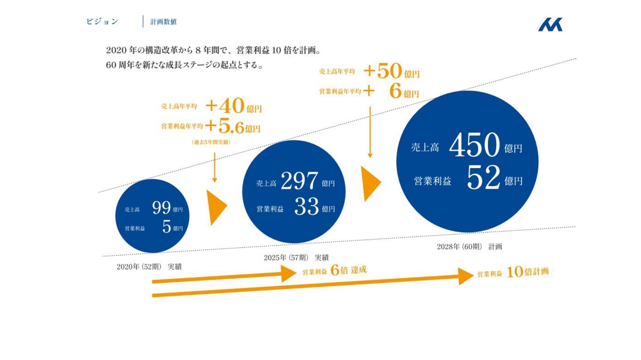 矢吹:2020年の構造改革から8年間で、営業利益を10倍にする計画です。60周年を、新たな成長ステージの起点としたいと考えています。中期計画の3年後にあたる2028年(60期)には、売上高を450億円とし、営業利益は2020年(52期)の実績である5億円から52億円へと10倍にする計画です。