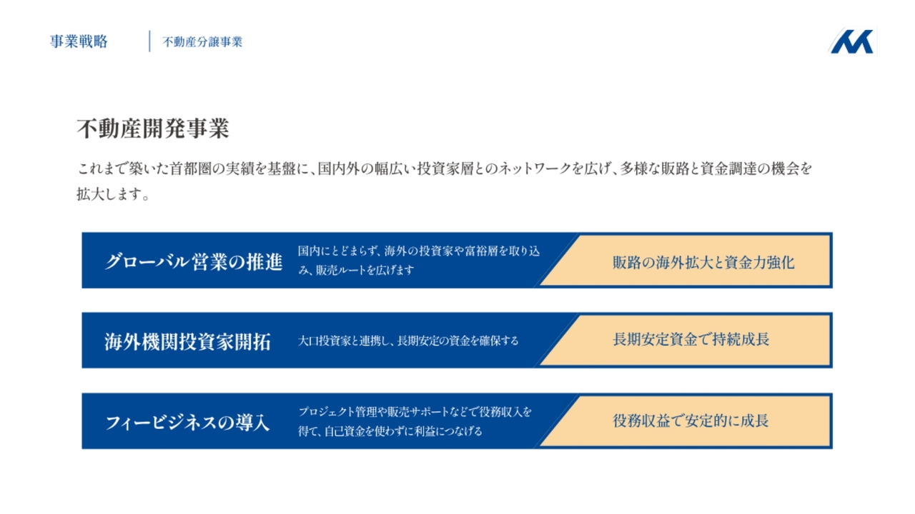 グローバル営業の推進についてですが、国内にとどまらず、海外の投資家や富裕層を取り込むことで販売ルートを広げています。具体的には、台湾に明豊現地法人を設立し、台湾在住の富裕層を対象に販路の海外拡大や資金力の強化を進めています。