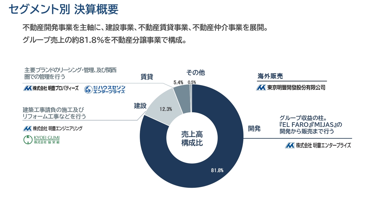 矢吹:グループ全体の構成としては、81.8パーセントが不動産の開発事業です。これは、土地を仕入れ、建設し、販売する事業で、売上の中でも最も大きな割合を占めています。