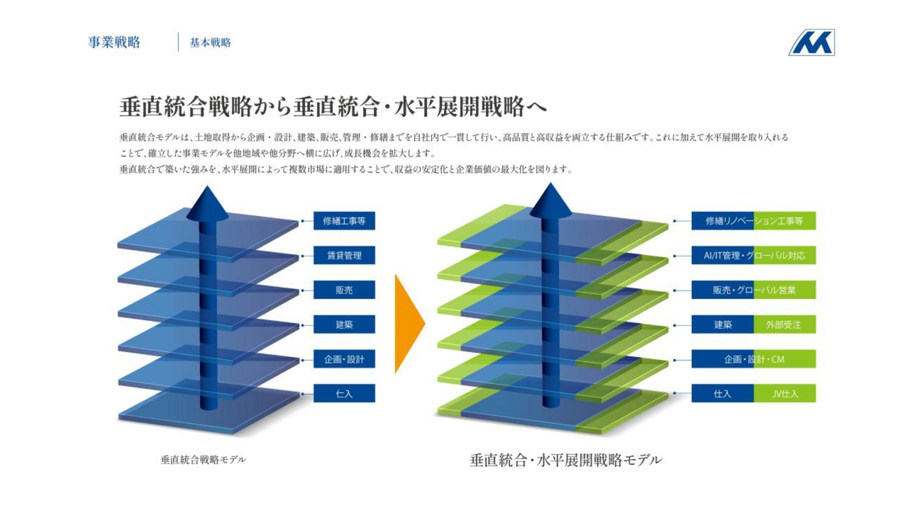 垂直統合モデルは、土地の取得から企画・設計、建築、販売、管理、修繕までを自社内で一貫して行い、高品質と高収益を両立する仕組みです。さらに、水平展開を取り入れることで、確立した事業モデルを他地域や他分野へ横展開し、成長機会を拡大していきます。
