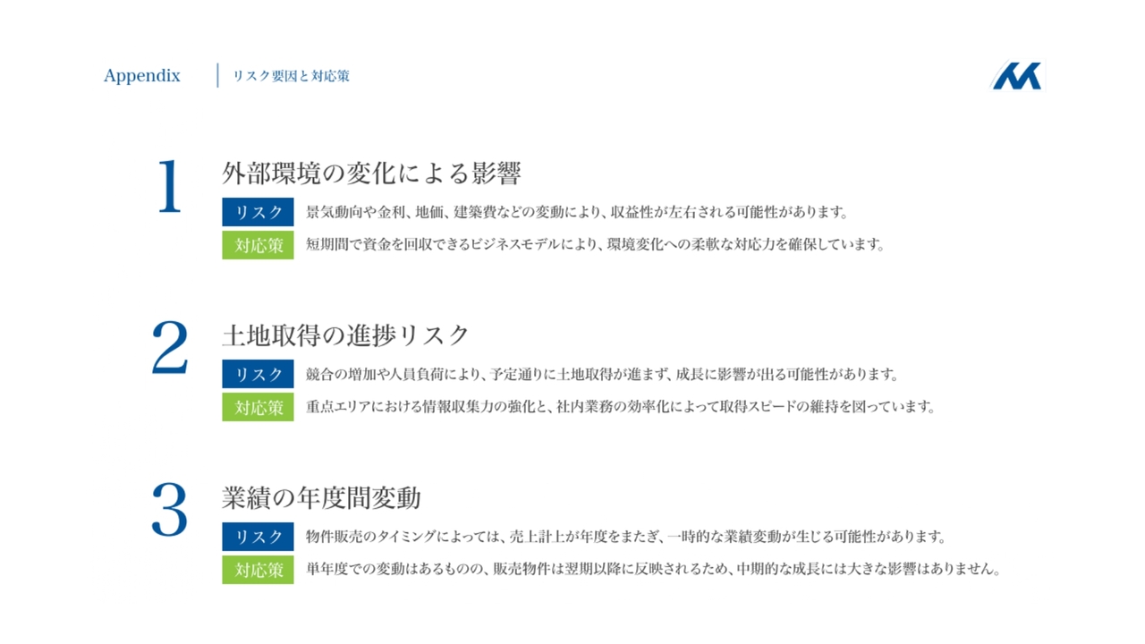 2つ目は、土地取得の進捗リスクです。競合の増加や人員負担により、予定どおりに土地取得が進まず、成長に影響が出る可能性があります。対応策としては、重点エリアにおける情報収集力の強化と、社内業務の効率化によって取得スピードの維持を図っています。