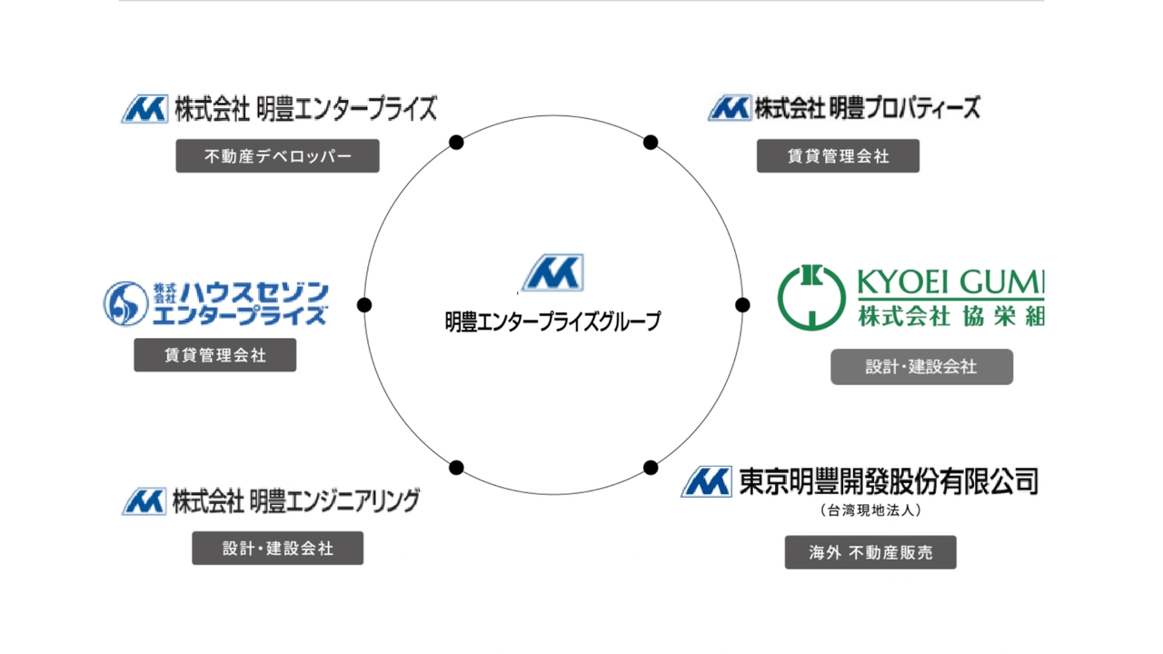 矢吹:グループ会社として、不動産を開発する明豊エンタープライズ、その開発した不動産を賃貸管理する株式会社明豊プロパティーズ、さらにその物件の設計・建設を行う株式会社協栄組、加えて海外の不動産販売を主に手がける、台湾にある現地法人等があります。