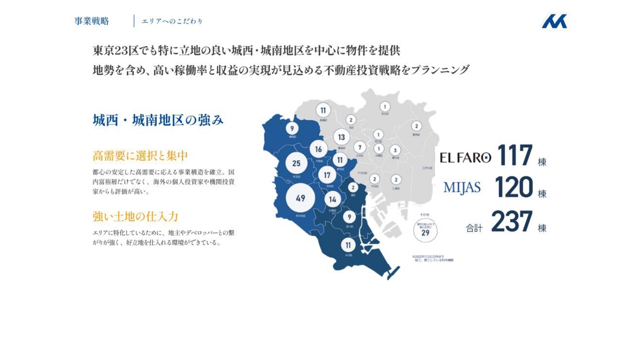 主力事業は、新築1棟投資用賃貸住宅シリーズ「EL FARO(エルファーロ)」と「MIJAS(ミハス)」の開発です。いずれもスペインの地中海をコンセプトに、魅力的なデザインと最新トレンドを押さえた上で、上質な設備・仕様を採用し、2025年7月時点で平均稼働率は97パーセントを維持しています。